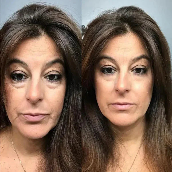 Contours du visage plus nets, ovale redessiné, poches sous les yeux réduites, teint plus lumineux.